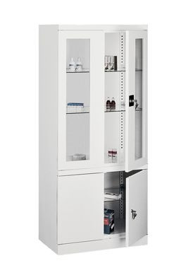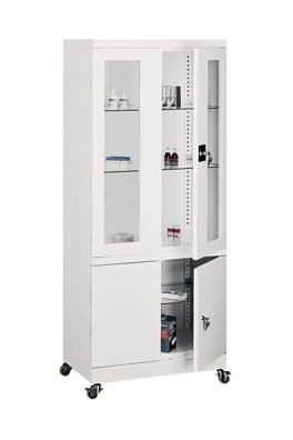 Des armoires médicales avec une partie basse métallique à 2 portes pleines (non vitrées) sont proposées permettant ainsi de disposer d’un rangement indépendant avec un jeu de clés différent pour y ranger accessoires et matériels médicaux à l’abri des regards.