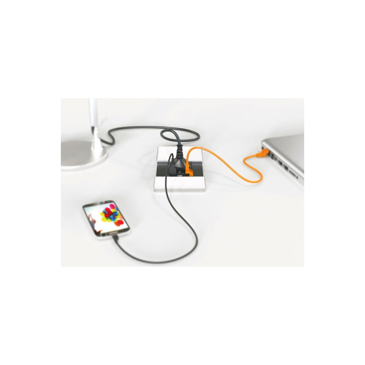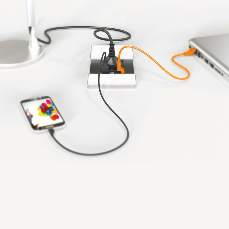 Encastrable et très bien équipé, SLIDE est pourvu de 2 clapets de protection coulissant, d'une prise électrique avec mise à la terre, d'un port USB + un port RJ45. Il comprend également un cordon d’alimentation de 2 m.