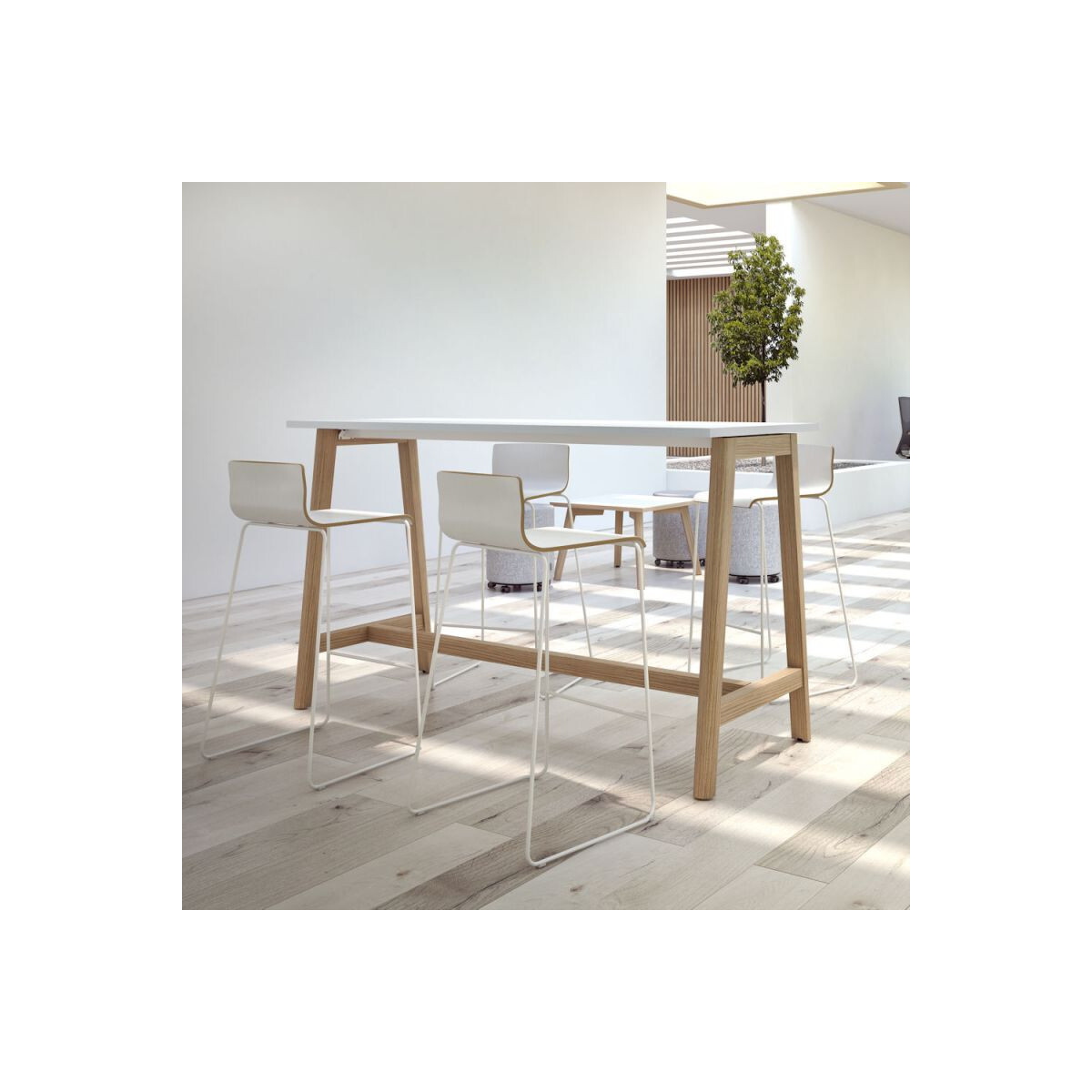 La table haute NET WOOD permet de se retrouver, d'échanger, de partager autant dans une cafétéria qu'un Open-Space ou une salle de réunion.