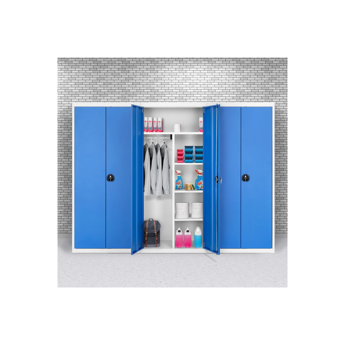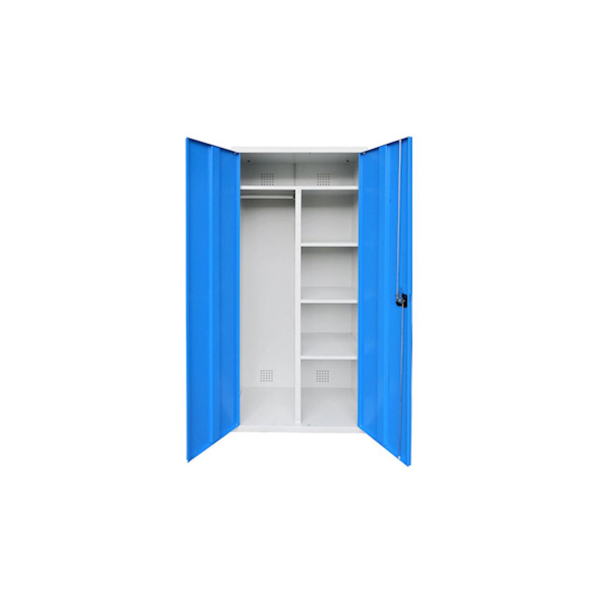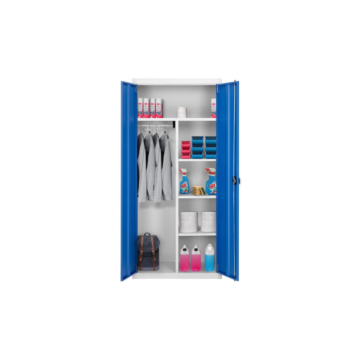 L'armoire L343, penderie de rangement, est adaptée aux utilisations multiples: dotée d’une penderie et de plusieurs compartiments de rangement, cette armoire vestiaire peut servir à de multiples usages.
